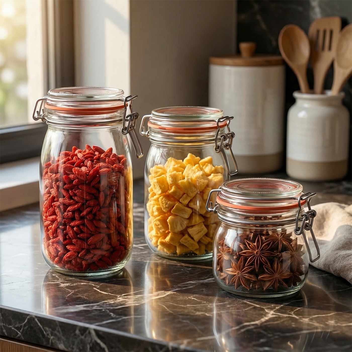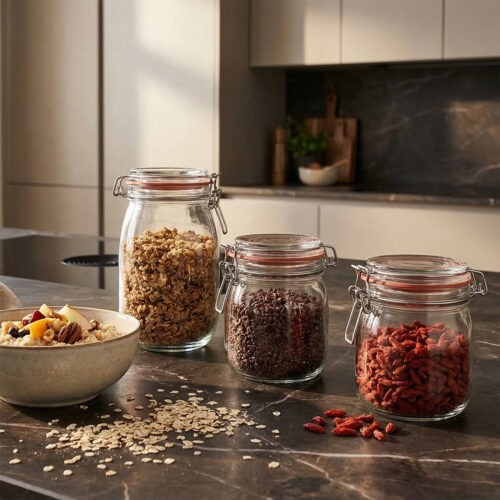 Ich bewahre meinen Tee, Haferflocken und getrocknete Früchte in euren Einmachgläsern auf. Der Deckel schließt gut ab und lässt keine Luft oder Feuchtigkeit hindurch.
