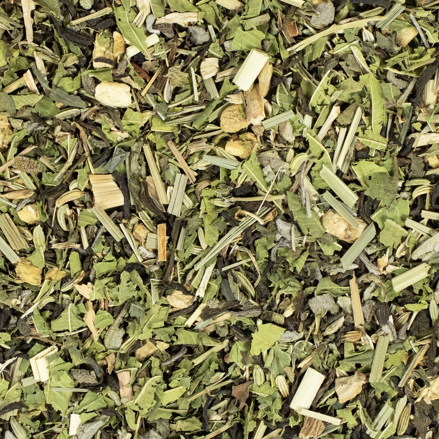 Zutaten: Grüner Tee, Zichorienwurzel, Fenchelsamen, Ingwer, Verveine, Salbei, Lemongras, Pfefferminze – naturrein, ohne Zusatzstoffe.